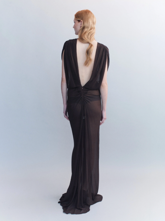 Helene Ruched V Neck Gown - Dark Brown