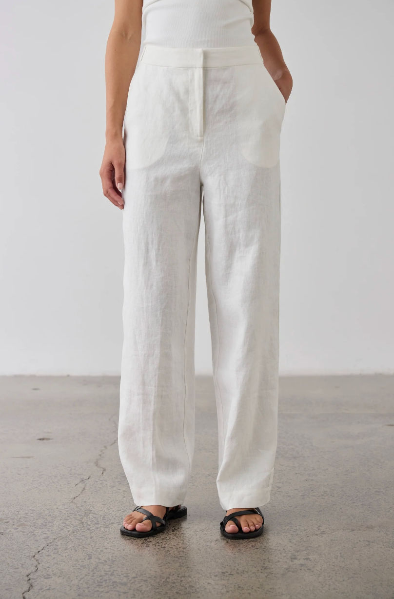 An elevated take on relaxed summer dressing. These women's linen pants are crafted from 100% breathable linen, featuring a full zip and button closure, practical pockets, and a half elastic waist for all-day comfort. Cut with a flattering straight-through wide leg, they're finished with a button tab at the hem to wear wider or button for a softly tapered silhouette.