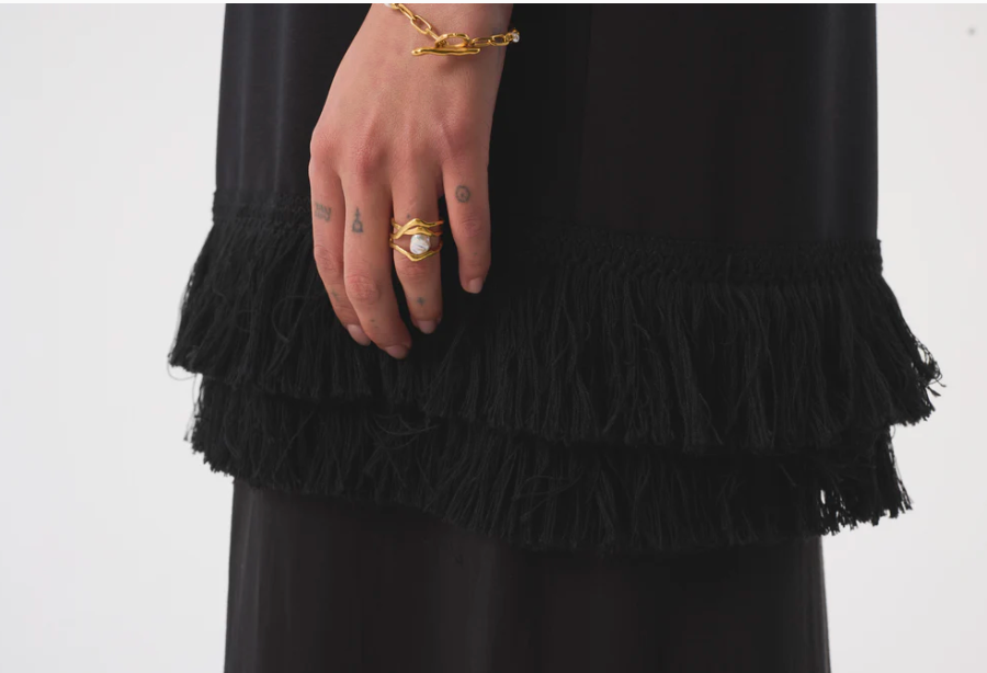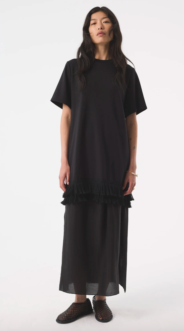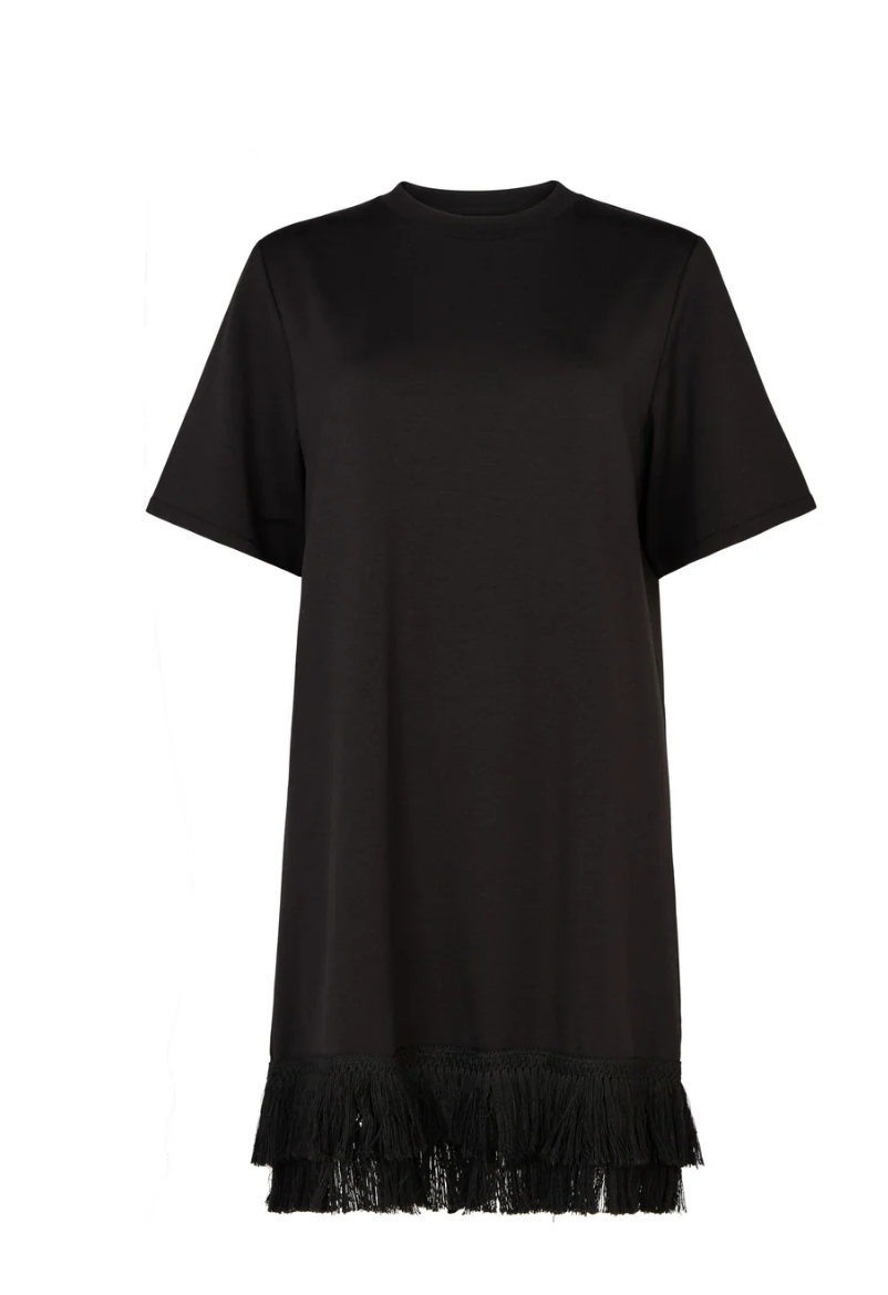 Elsa is our t-shirt dress in black Italian fleece, cut to a relaxed silhouette and finished with tonal cotton fringe for soft movement and texture. Elsa is a boxy fit.