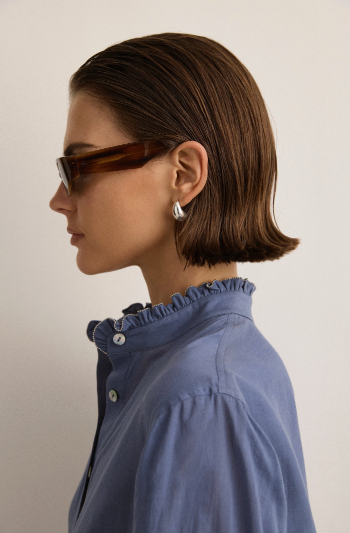 The Siena Blouse in lightweight Italian cotton. A mandarin collar with delicate frill and hand-sewn silver ball trim at the neck and cuffs. The relaxed silhouette features a shaped back yoke and elongated hem.