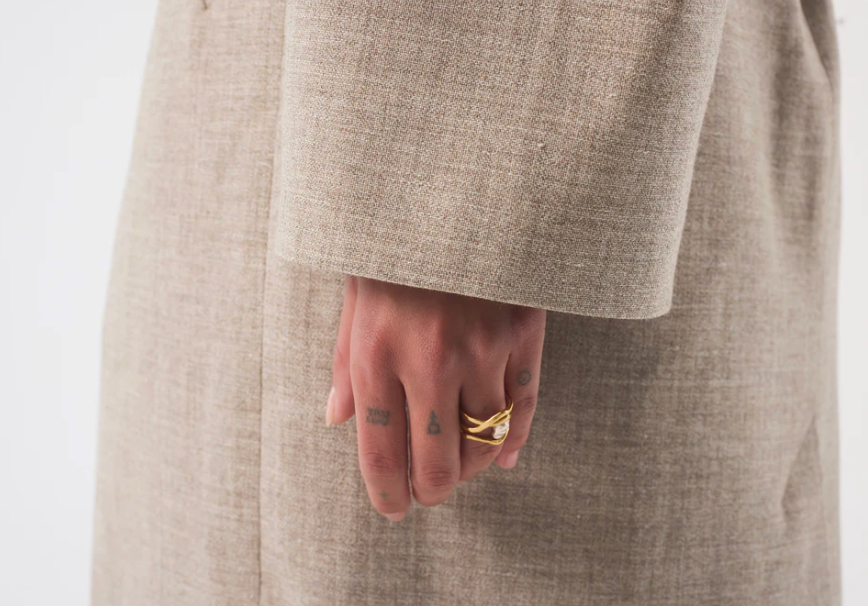 Dree is our light wrap coat in undyed grey wool linen blend, designed with a soft drape and effortless structure. Faux pearl buttons at the shoulder add a subtle point of detail, while the self-tie belt allows for flexible styling. A relaxed silhouette for easy layering through the seasons.